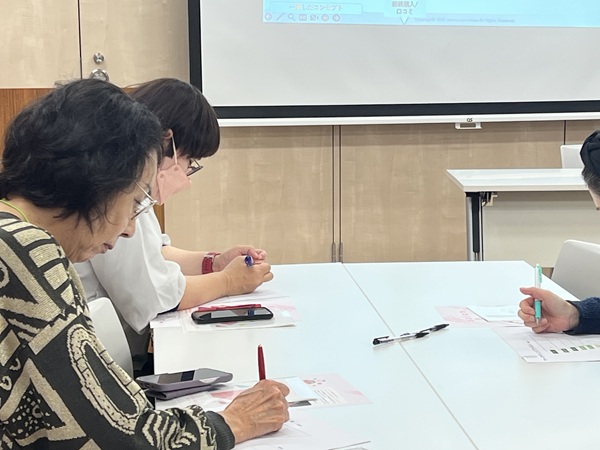 参加者は、マーケティングや顧客導線をテーマに5分間のワークに取り組み、レジュメに書き込みながら思考を整理し、続くシェアタイムでは、自身の方向性を再確認されていました。榊原さんは「短い時間で直感的に書くことが、本質に近づく近道です」と語っていました。